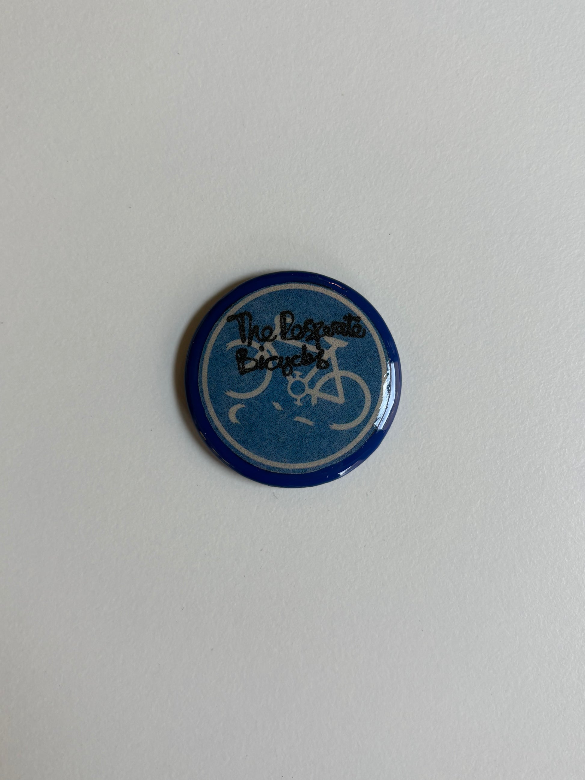 Desperate Bicycles. 1.5”. All of these buttons are handmade with enamel paint and collage over antique/vintage campaign buttons.