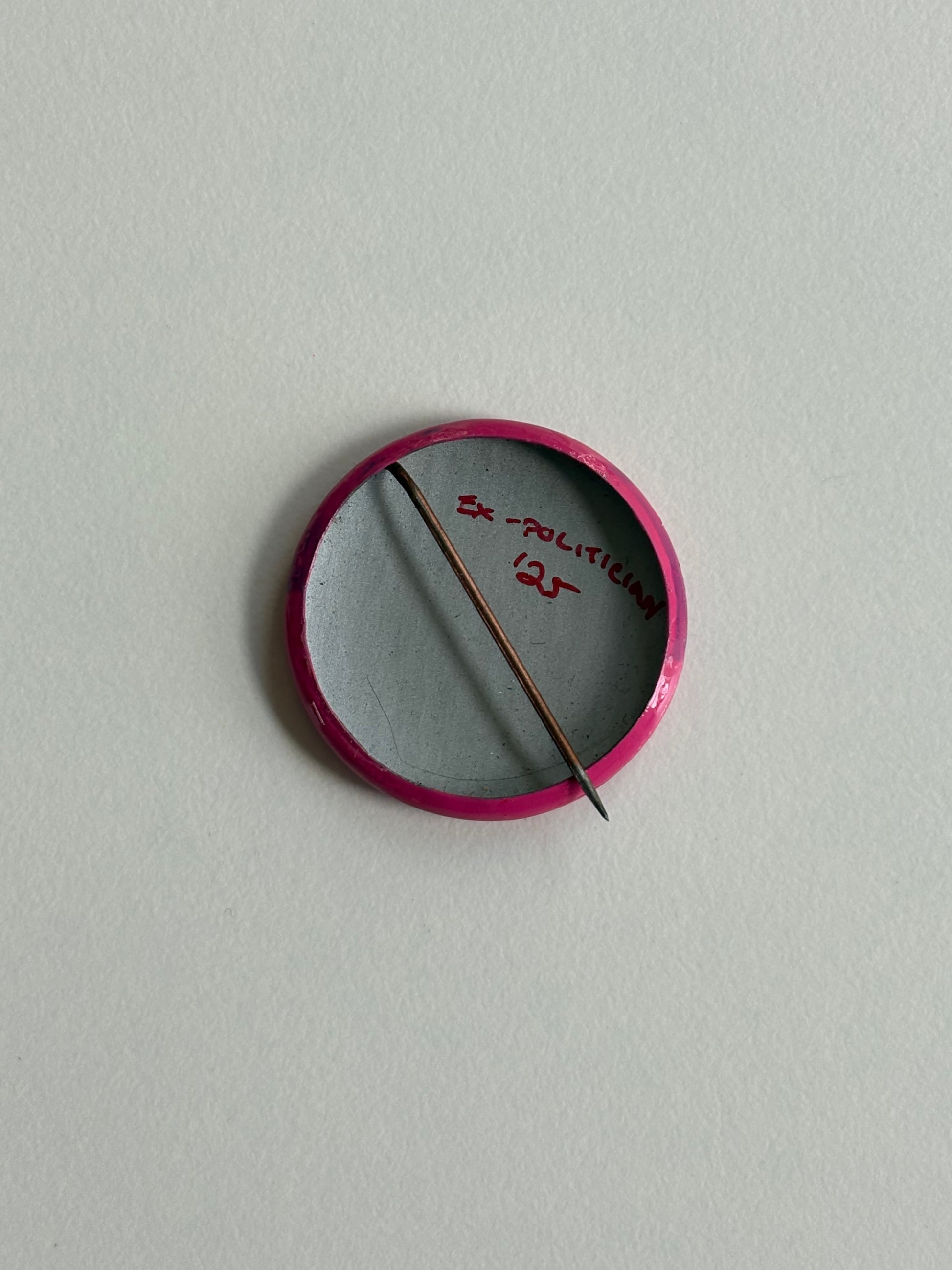 Edith Nylon. 1”. All of these buttons are handmade with enamel paint and collage over antique/vintage campaign buttons.