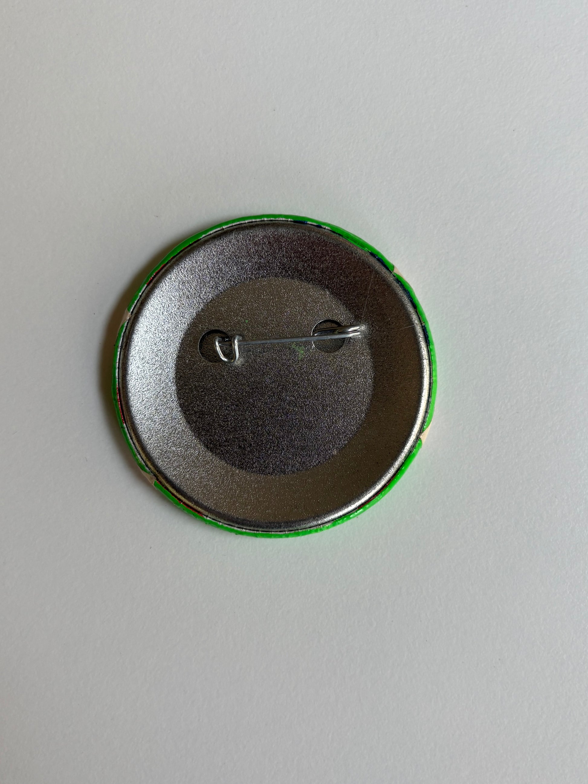 Hysteria Ward. 2.25”. Neon green. All of these buttons are handmade with enamel paint and collage over antique/vintage campaign buttons.