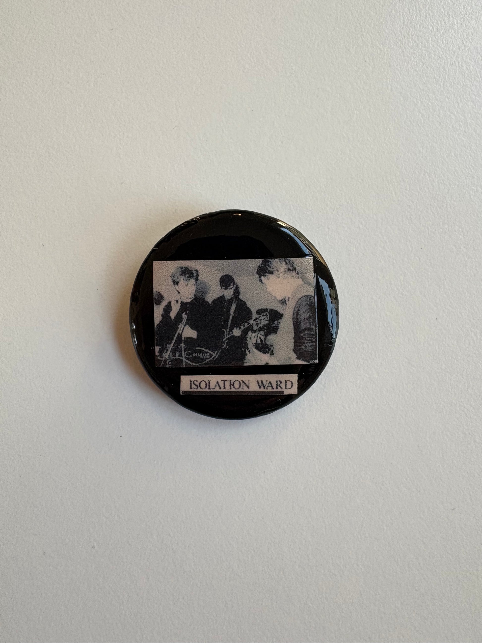 Isolation Ward. 1.25”. All of these buttons are handmade with enamel paint and collage over antique/vintage campaign buttons.