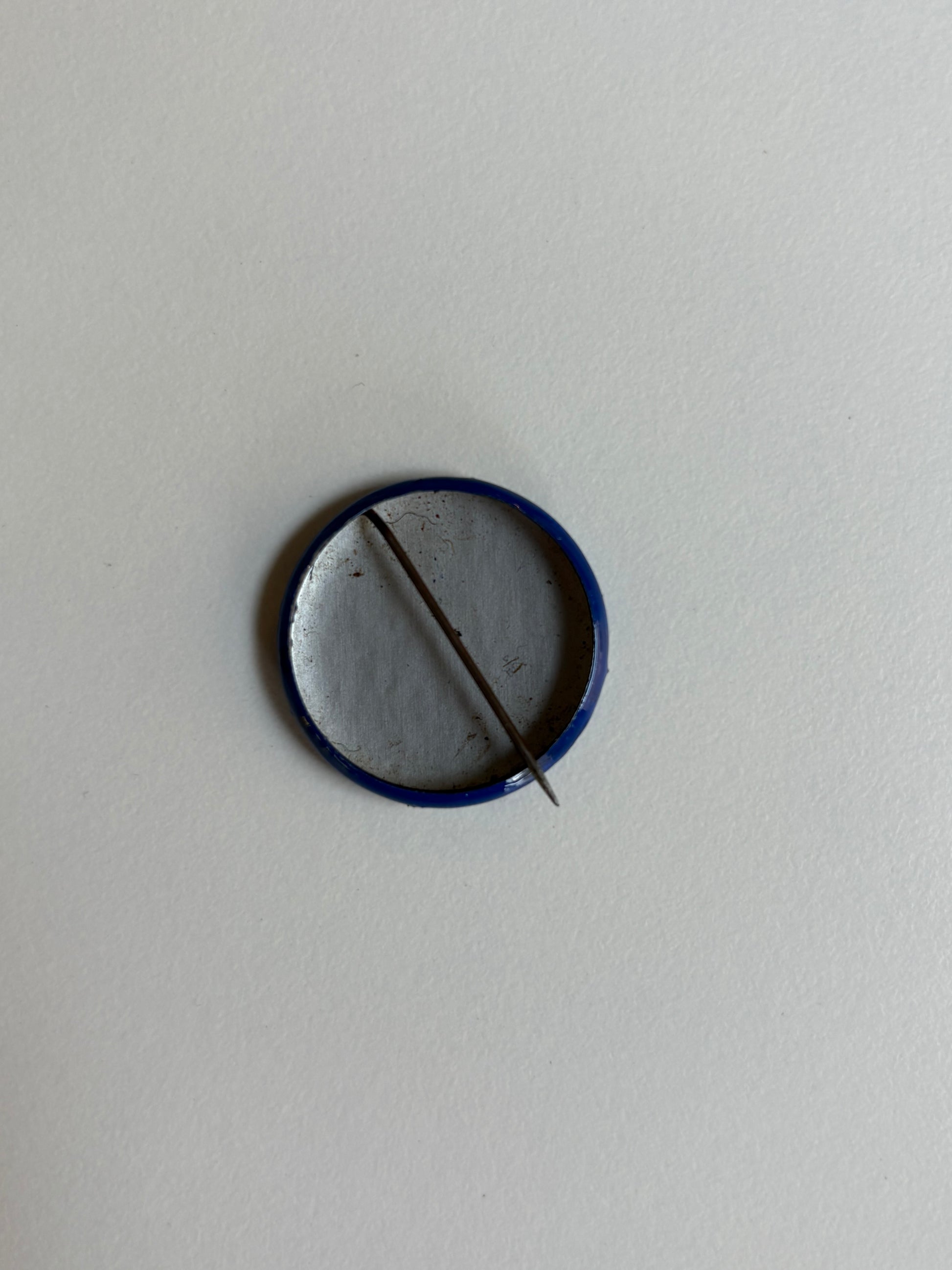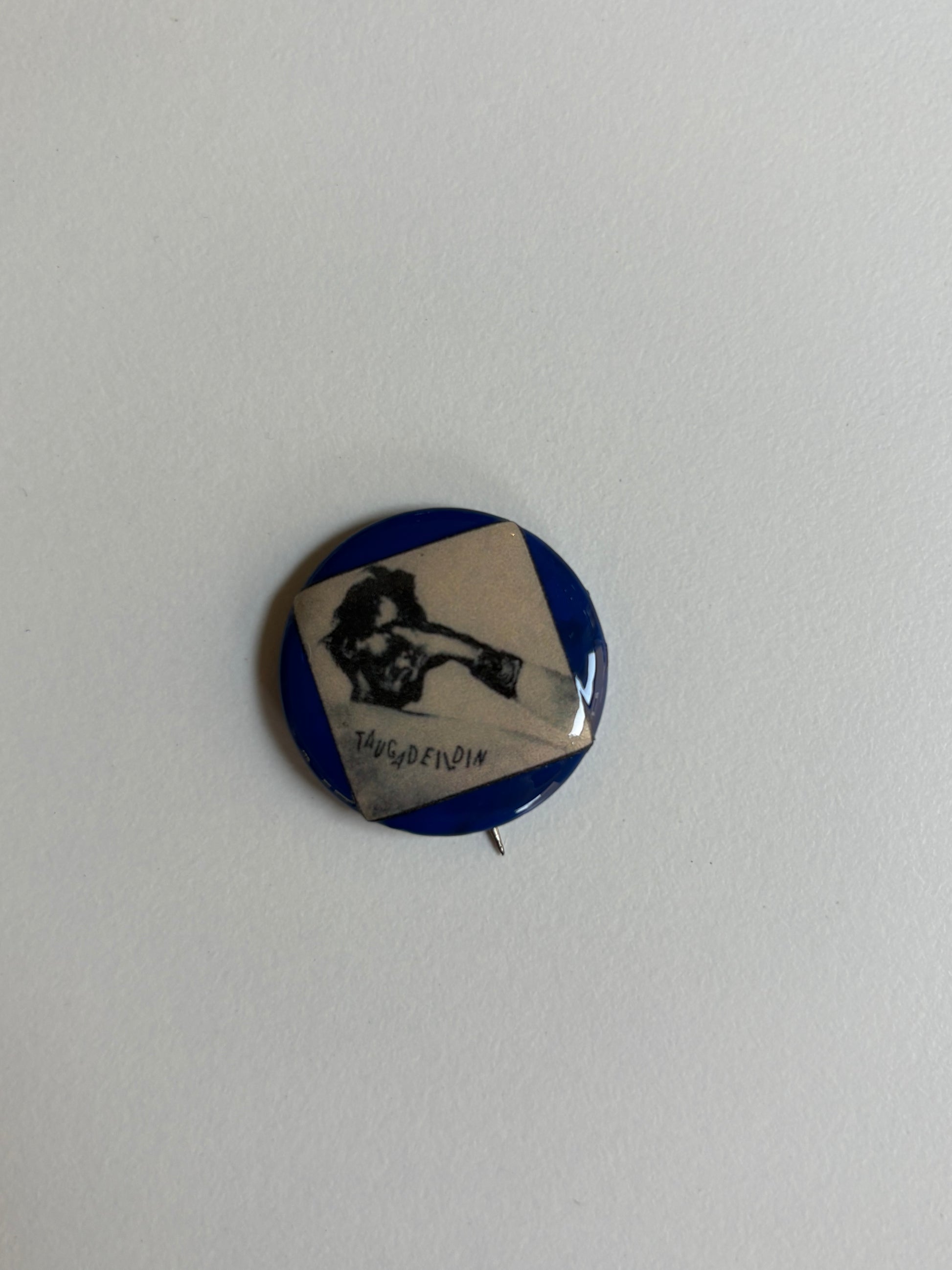 Taugadeildin. 1.25”. All of these buttons are handmade with enamel paint and collage over antique/vintage campaign buttons.